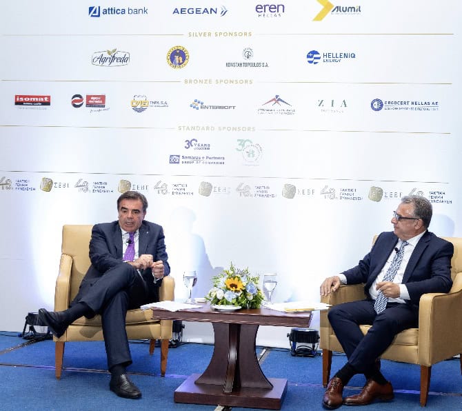Ο Αντιπρόεδρος της Ευρωπαϊκής Επιτροπής, κ. Μαργαρίτης Σχοινάς ανέλυσε ένα ολοκληρωμένο σχέδιο που η Ευρωπαϊκή Επιτροπή έχει ήδη προσδιορίσει, που βασίζεται στα διδάγματα από την διαχείριση της πανδημίας και το εμβληματικό Σχέδιο για την Ανάκαμψη και την Ανθεκτικότητα. Τόνισε ότι διανύουμε την εποχή της άνοιξης των ελληνικών εξαγωγών ως συνέπεια της βελτίωσης της παραγωγικότητας και της ανταγωνιστικότητας του επιχειρηματικού περιβάλλοντος με την Ευρώπη πάντα στο πλευρό της Ελλάδας. Άλλωστε η ενιαία αγορά είναι ο μεγαλύτερος εξαγωγικός προορισμός των ελληνικών προϊόντων με περισσότερες από τις μισές ελληνικές εξαγωγές να κατευθύνονται σε κάποιο άλλο Κράτος Μέλος αποδεικνύοντας τη συνεχιζόμενη σημασία της Ένωσης για την ανάπτυξη της Ελληνικής οικονομίας. Η Ευρώπη καλείται να δημιουργήσει τις συνθήκες όχι απλά για μια πράσινη αλλά και για μια αναπτυξιακή Ευρώπη. Να ανταπεξέλθει άμεσα στον παγκόσμιο ανταγωνισμό, ιδιαίτερα σε τομείς όπως οι «καθαρές τεχνολογίες», η ψηφιοποίηση, οι δεξιότητες και το ανθρώπινο δυναμικό, η διαρκής στήριξη επιχειρήσεων και εργαζομένων της Ευρώπης για να διασφαλίσει την ανταγωνιστικότητα της, και ασφαλώς η επίλυση παγκόσμιων προκλήσεων, με έμφαση στην μετανάστευση και την προστασία των συνόρων. Χαρακτηριστικά ανέφερε «Μπροστά σε ένα νέο ξεκίνημα για την στρατηγική αυτονομία της Ευρώπης, ποτέ άλλοτε δεν είχε στη διάθεσή της τόσα μέσα».
