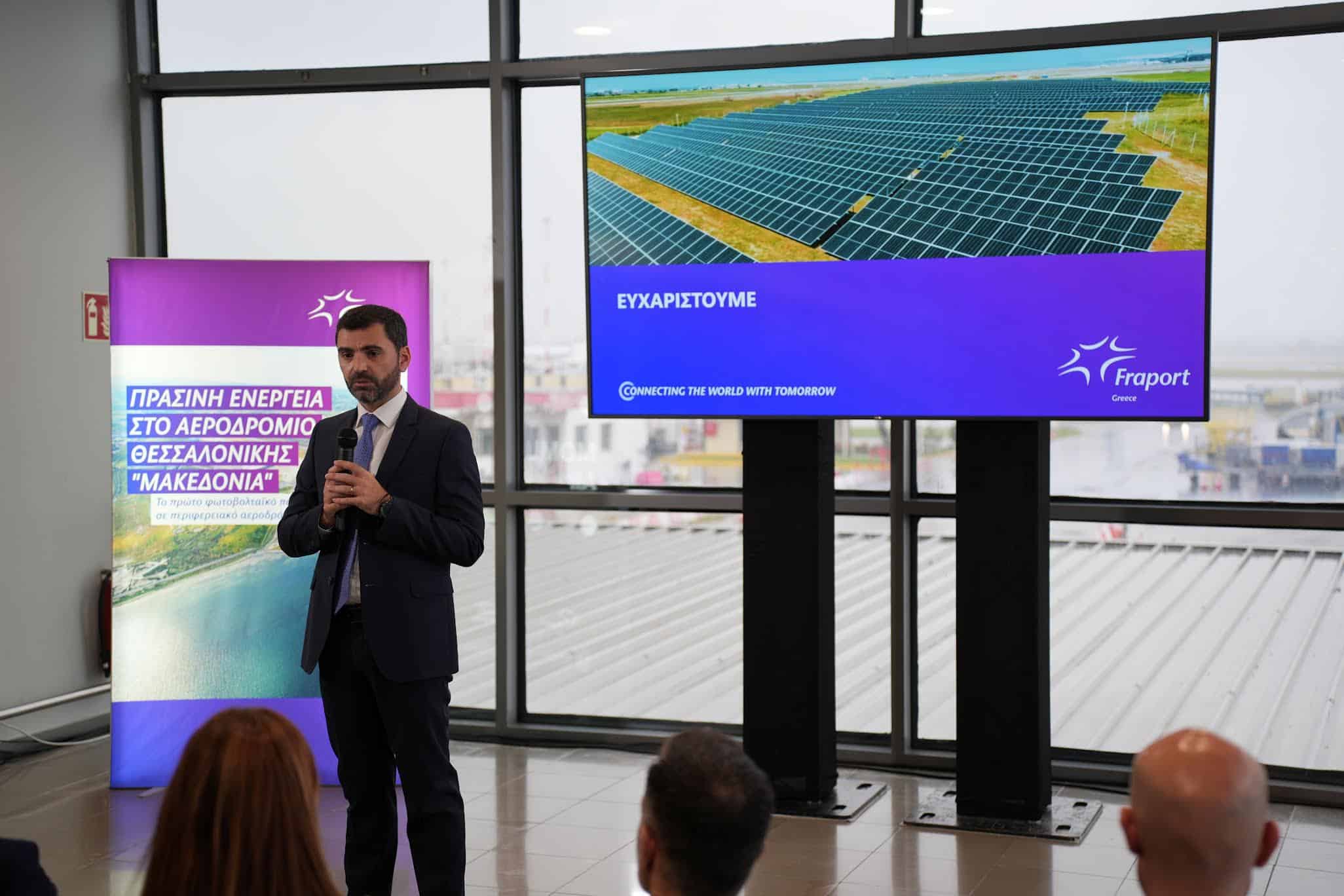 Η Fraport Greece ανακοινώνει την εγκατάσταση και λειτουργία φωτοβολταϊκού πάρκου στο αεροδρόμιο Θεσσαλονίκης «Μακεδονία», το οποίο αποτελεί το πρώτο φωτοβολταϊκό πάρκο που υλοποιείται σε περιφερειακό αεροδρόμιο στην Ελλάδα, ενισχύοντας τη στρατηγική της για βιώσιμη ανάπτυξη και μείωση του περιβαλλοντικού αποτυπώματος των αεροδρομίων που διαχειρίζεται.