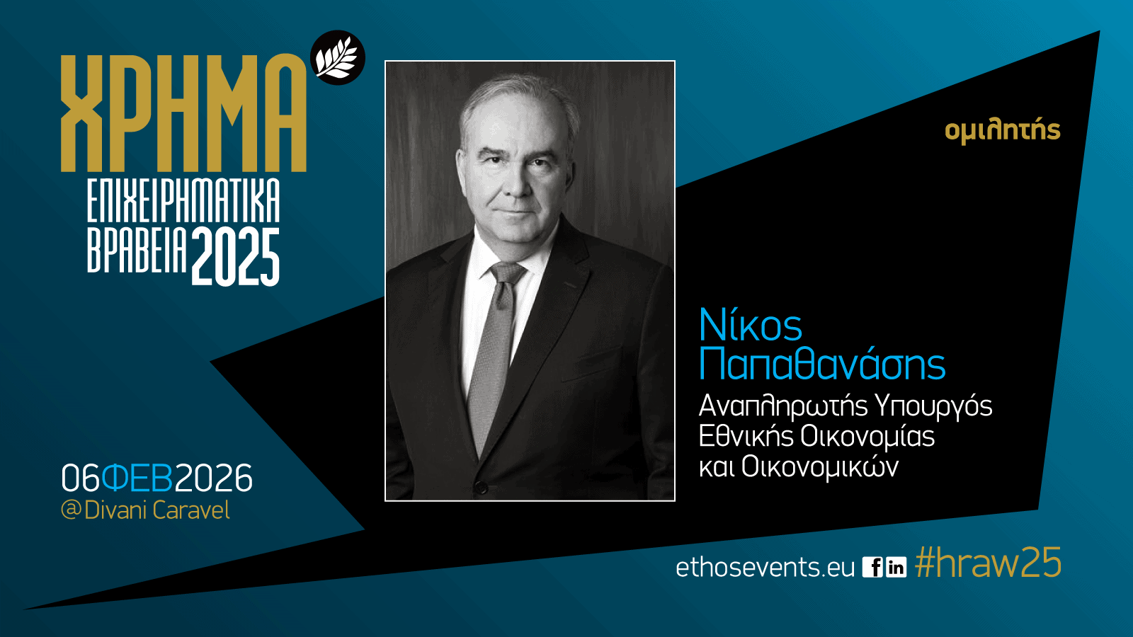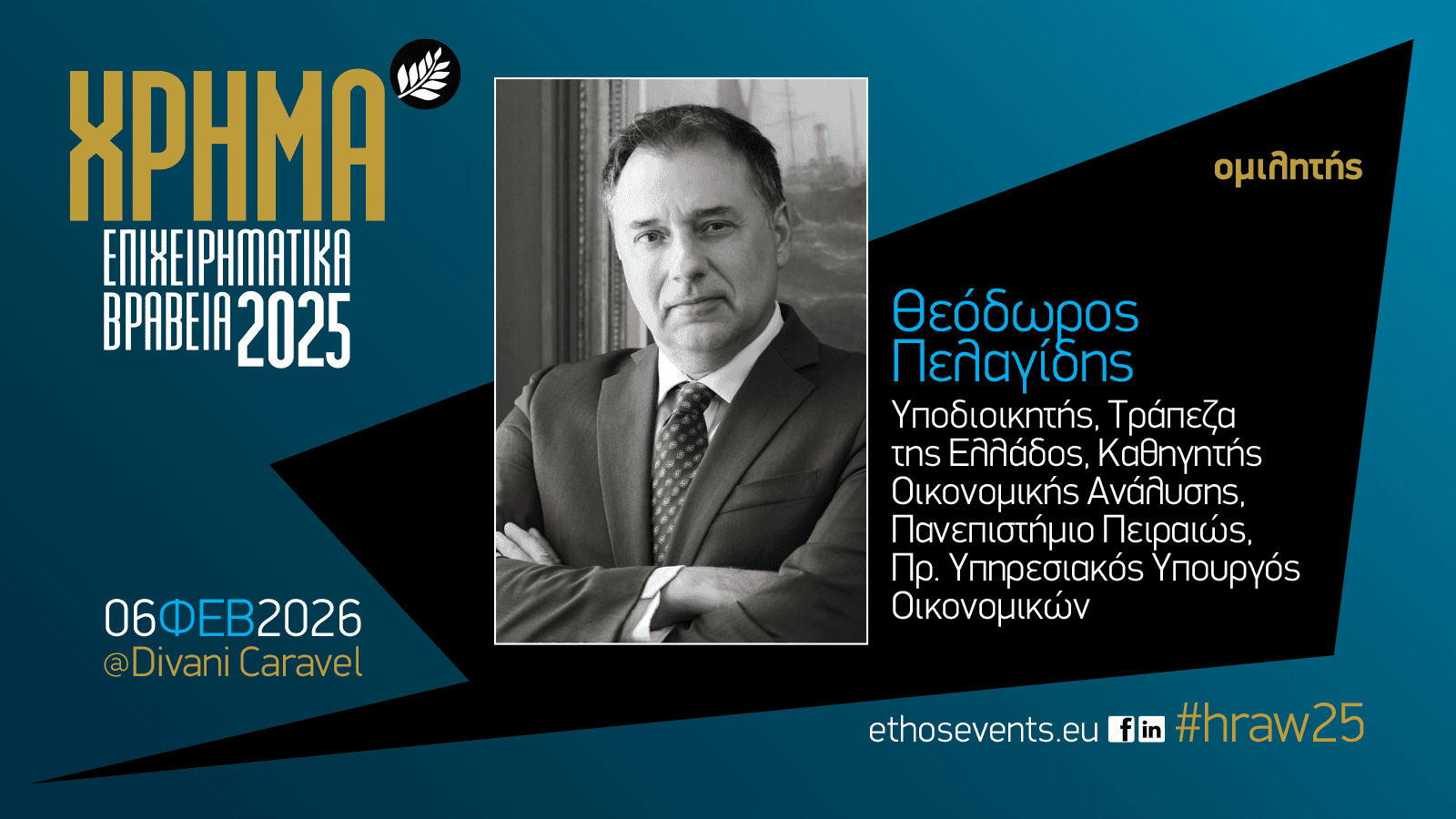 Την Παρασκευή 6 Φεβρουαρίου 2026, για 23η συνεχή χρονιά, η Τελετή Απονομής των Επιχειρηματικών Βραβείων ΧΡΗΜΑ – #hraw25 θα αναδείξει τις επιχειρήσεις που στηρίζουν την ελληνική οικονομία και συμβάλλουν διαχρονικά στη διαμόρφωση και ενίσχυση του χρηματιστηριακού θεσμού. Η διοργάνωση πραγματοποιείται από το περιοδικό ΧΡΗΜΑ, σε συνεργασία με την ethosEVENTS, το οικονομικό και επιχειρηματικό portal banks.com.gr και την ηλεκτρονική εφημερίδα ΧΡΗΜΑ WEEK.