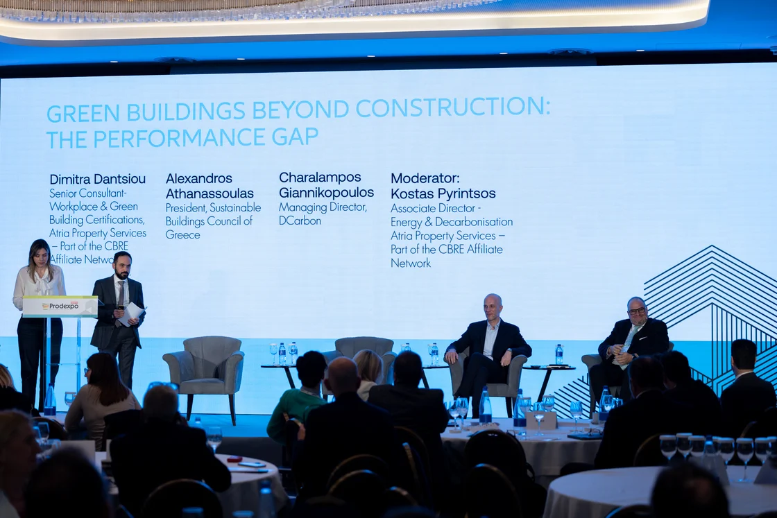 Στη σημασία των πράσινων κτιρίων και στην πιστοποίηση αναφέρθηκαν κατά την παρουσίαση τους ο κ. Κώστας Πυρίντσος, Associate Director – Energy & Decarbonisation, Atria Property Services – Μέλος του δικτύου θυγατρικών της CBRE και η κα. Δήμητρα Ντάντσιου, Senior Consultant – Workplace & Green Building Certifications, Atria Property Services – Μέλος του δικτύου θυγατρικών της CBRE.