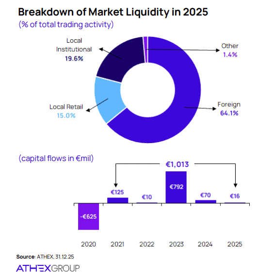 Κοινή όμως είναι εκτίμηση, πως η εκκίνηση του 2026 είναι εντελώς διαφορετική- και με περισσότερο βάθος- σε σχέση με την προηγούμενη 4ετία, η αγορά είναι σε φάση μετασχηματισμού και μετά από 13 χρόνια επιστρέφει στις ανεπτυγμένες αγορές, οπότε καθημερινά λαμβάνει χώρα ένα άτυπο rebalancing αλλαγής του “μωσαϊκού” των χαρτοφυλακίων που συμμετέχουν.