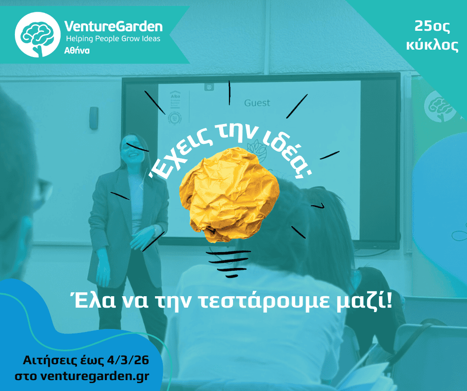 Ο επιταχυντής επιχειρηματικών ιδεών αρχικού σταδίου, VentureGarden Αθήνα, ο οποίος απευθύνεται σε κάθε άτομο, ανεξάρτητα από την ηλικία, την καταγωγή, τον προσανατολισμό ή το υπόβαθρό του, δέχεται αιτήσεις για τον 25ο κύκλο του έως την Τετάρτη, 4 Μαρτίου 2026. Το πρόγραμμα περιλαμβάνει 8 εκπαιδευτικά εργαστήρια που πραγματοποιούνται σε διάστημα 8 εβδομάδων και υπάρχει δυνατότητα περαιτέρω υποστήριξης από έμπειρους μέντορες. Ο 25ος κύκλος του VentureGarden Αθήνα ξεκινά την Τετάρτη, 1 Απριλίου, με συναντήσεις κάθε Δευτέρα και Τετάρτη, από τις 18:00 έως τις 21:00, στις εγκαταστάσεις του Alba Graduate Business School (Ξενίας 6-8, Αθήνα).
