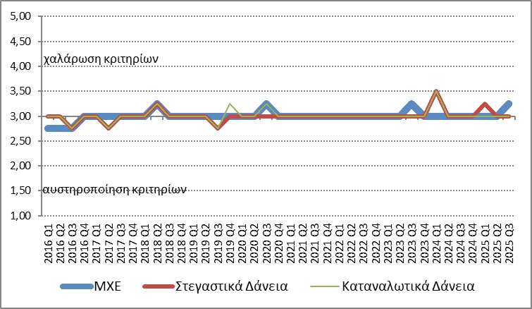 Κατά το γ΄ τρίμηνο του 2025, τα κριτήρια χορήγησης στεγαστικών και καταναλωτικών δανείων προς τα νοικοκυριά παρέμειναν αμετάβλητα, σε σχέση με το β΄ τρίμηνο του 2025 (Διάγραμμα 1). Οι συνολικοί όροι χορήγησης στεγαστικών δανείων έγιναν πιο αυστηροί ως έναν βαθμό κατά την διάρκεια του γ΄ τριμήνου του 2025. Οι συνολικοί όροι χορήγησης των καταναλωτικών και λοιπών δανείων παρέμειναν αμετάβλητοι για το γ΄ τρίμηνο του 2025. Τα κριτήρια χορήγησης στεγαστικών και καταναλωτικών δανείων αναμένεται να παραμείνουν αμετάβλητα και κατά τη διάρκεια του δ΄ τριμήνου του 2025.