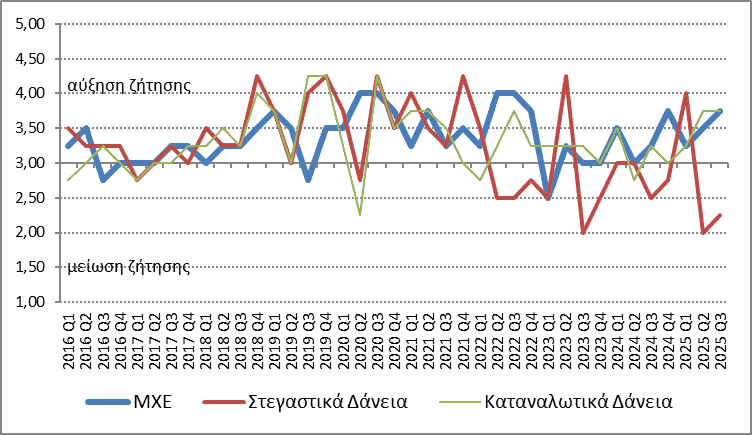 Κατά το γ΄ τρίμηνο του 2025, η συνολική ζήτηση δανείων από τις ΜΧΕ αυξήθηκε, αφενός λόγω χρηματοδοτικών αναγκών αφετέρου λόγω διεύρυνσης των εναλλακτικών πηγών χρηματοδότησης. Για το δ΄ τρίμηνο του 2025, οι τράπεζες εκτιμούν ότι η συνολική ζήτηση από τις ΜΧΕ θα αυξηθεί.